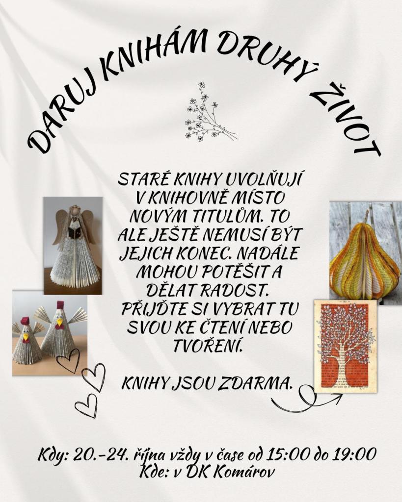 Od 20. do 24.10. se v KD Komárov koná akce, která umožňuje vybrat si staré knihy uvolňující místo novým titulům. Akce probíhá každý den od 15:00 do 19:00 a všechny knihy jsou zdarma.